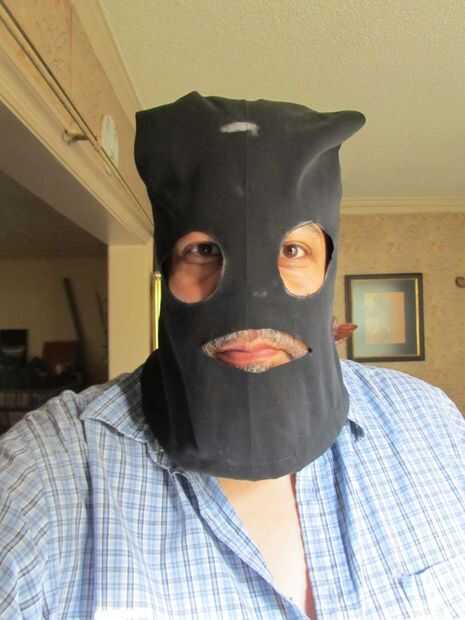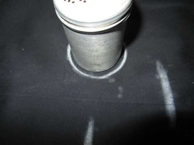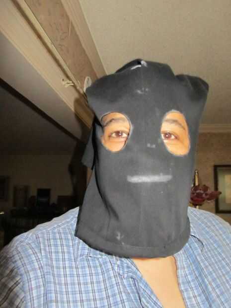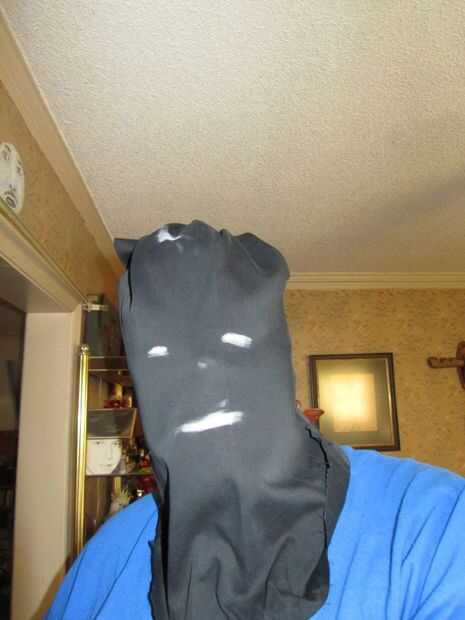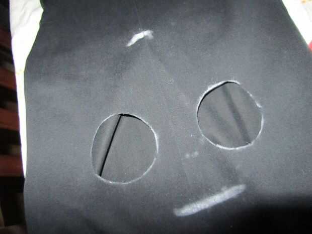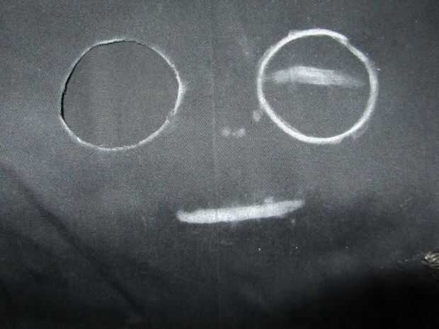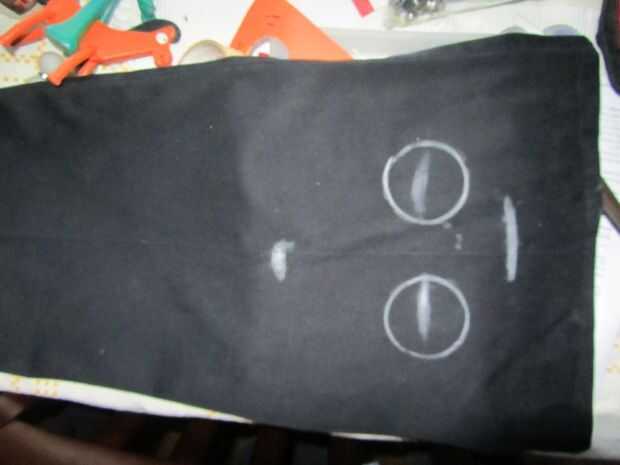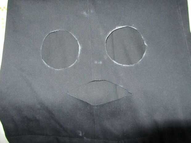 Utilizar una plantilla o un batido sal etc. para hacer círculo para aberturas de ojo. Dibujar manos libres also.and dibujar una abertura de la boca. Asegúrese de que la apertura es más pequeño y luego la pantalla de parches