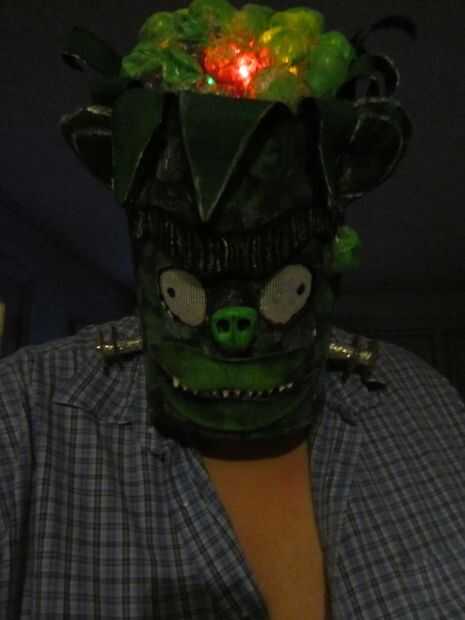 2. Ponga una pequeña batería motor en la parte superior - cortar un trozo de cartón en un círculo del tamaño de la abertura en la parte superior, empuje cerca de la cima como sea posible y fijar con pistola de pegamento. Cortar un agujero en la cartulina del tamaño del motor, pegamento en su lugar, conecte la batería pequeña y cortar un agujero para un interruptor (en la parte superior o en la parte posterior de la máscara). Hacer un taladro de cartón para éste. (sólo un cono de una espiral alrededor de él). http://www.chellboy.com/chellboy/masks/mask2.m4v