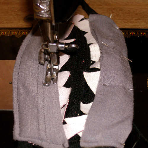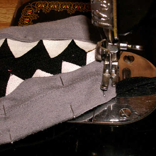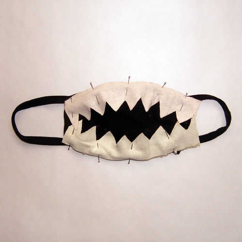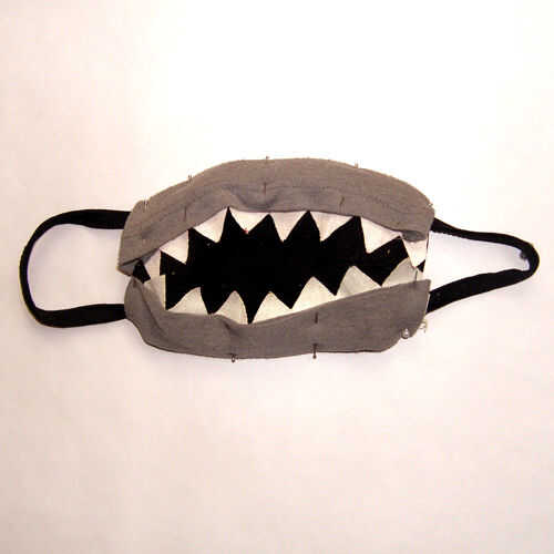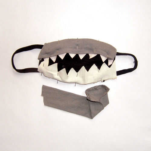 Luego corté un trozo de materia gris para que coincida con la forma de la careta entera, agregar 1/4 de pulgada más espacio a lo largo de los bordes. Que cortar esta pieza por la mitad para formar las mandíbulas superiores e inferiores y colocar el material gris sobre la máscara. Ya quité los pernos que sostienen los dientes en su lugar, he doblado y cubrió el material gris a lo largo de los bordes y alrededor de los dientes, asegurándose de que mucho de los dientes mostraban. Coser a lo largo de los bordes y la mascarilla es completa!