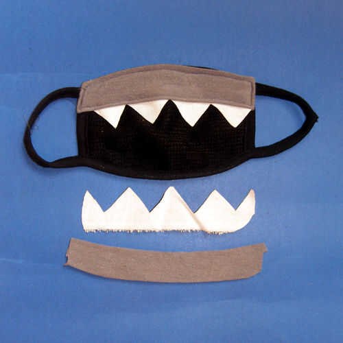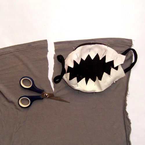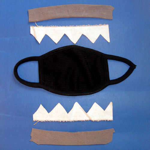 Para la cara del tiburón corté la camiseta en dos tiras que la longitud de la máscara de mi rostro, entonces yo cortar irregular pequeñas muescas a lo largo de la longitud de un lado de cada una de las dos bandas. Luego cubrió los dientes sobre la mascarilla negra.