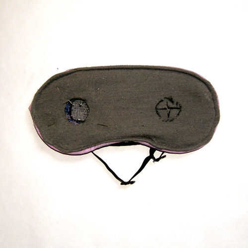 Primero se alinearon todos mis materiales, incluyendo una pieza gris de tela, un trozo de nylon negro y la máscara de ojo y cortarlas dejando media pulgada alrededor de los bordes de la máscara de ojo.