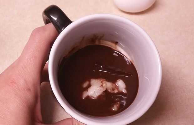 Mezclar en la yema de huevo. La yema de huevo frío comenzará a espesar la mezcla. No pongas esto en el microondas! No quiero cocinar accidentalmente cualquier pedacitos de huevo.