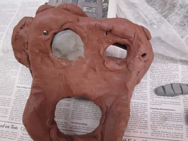 trabajo en la parte posterior de la máscara de ojos en agujeros para los ojos y untar suavemente la arcilla para las piezas en su lugar.