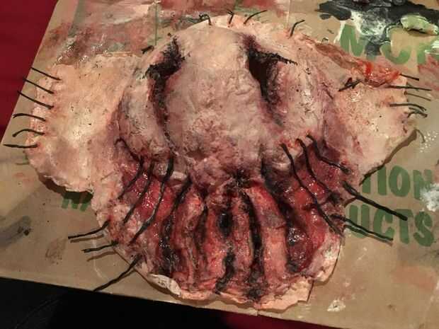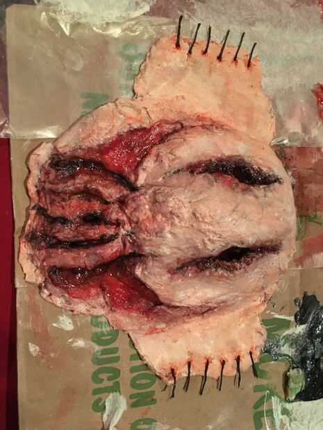 Usted puede pintar quieras te voy a contar cómo mía. Sólo sé que algunas pinturas y pegamento de caucho reacciona mal con los demás y produce un olor horrible. Prueba tuyo haciendo un pequeño trozo de látex en el papel de cera, mezcla 60/40 pintura para cemento luego con un cepillo lo. Deje que se seque. Si huele a utilizar pintura diferentes. Otra vez aprendido la manera dura. Tomar una mezcla de 40/60 con pintura blanca y la tapa usando un viejo pedazo de tela o el cepillo en el cemento todo puede. Deje que se seque y añadir color de la piel. Uso una cantidad muy pequeña de lo seco y lo cepillo en con el paño. Utilizar rotulador negro para los ojos y la boca. Luego mezcla 70/30 sangre falsa para cemento de goma y use el cepillo para aplicar en la boca y algunos en los ojos. Esto tendrá varias capas. Puntos de sutura fueron hechas de hilo aparte tirado con látex. Usted puede cortar la parte de atrás de los ojos hacia fuera y asegúrese de que los ajustes de máscara cortan ojos en consecuencia. Si recortas los ojos más, agregue más sharpie.