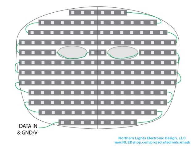 Cableado de datos de tira del LED: La teoría es conectar todas las filas de tira de LED en una larga cadena. Para WS2812B solamente las almohadillas DAT tienen que ser conectados en orden. Tierra/V- y + 5v puede ser conectado en cualquier lugar en la tira, no tiene que ser en los extremos.