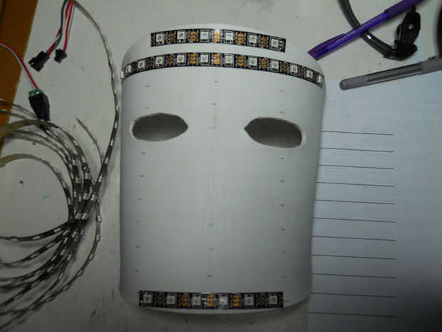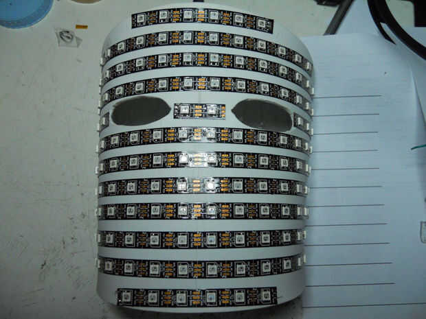 Tira LED cableado de alimentación: Tierra/V- y + 5v puede ser conectado en cualquier lugar en la tira, cada fila tiene una conexión con ellas. Fotos de cableado eléctrico fueron perdidos. Pero bastante simple.