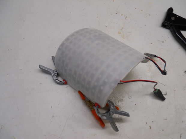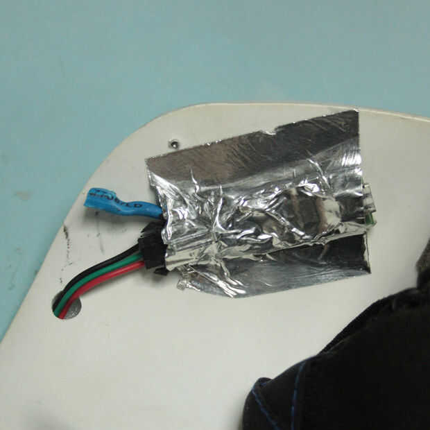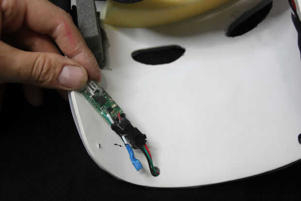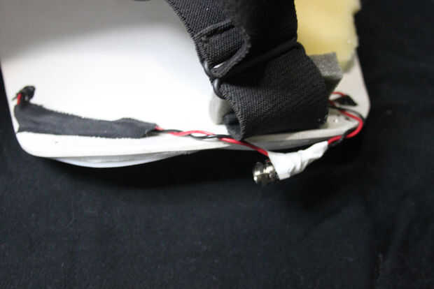 - Un cable de rescatados (de una verruga de la pared fuente de alimentación) con un tapón del cañón 2,1 x 5,5 mm añadido al soporte de la batería. Compañeros con la toma del panel montaje de barril que cuelga de la máscara. No hay ningún interruptor de que la máscara es encender y apagar desenchufándolo por ahora.
