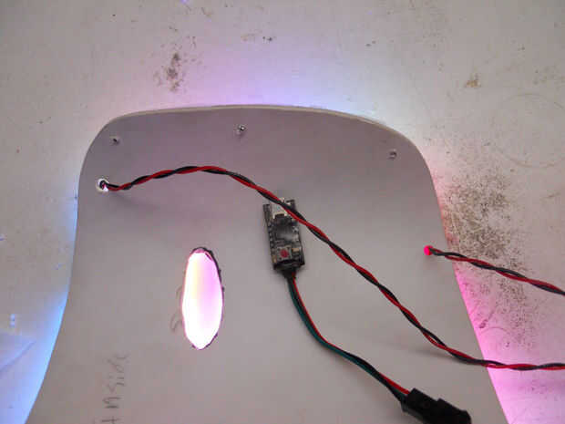 - Un jack de 2,1 mm x 5,5 mm barril fue conectado a los cables de alimentación. Nota Existen 2 carreras de potencia, una de las filas de la parte inferior y otra desde la parte superior. Aunque están conectados juntos en las tiras, esto ayuda a tener múltiples 'home runs' de la energía a proporcionar cuando actual requiere su necesaria. 142 píxeles podrían consumir hasta 8,52 amperios.