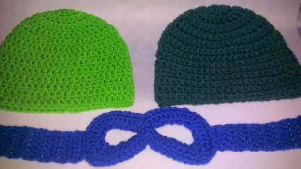 mi versión de un ninja tortuga gorrita tejida en verde brillante y oscuro con máscara azul de Leonardo.