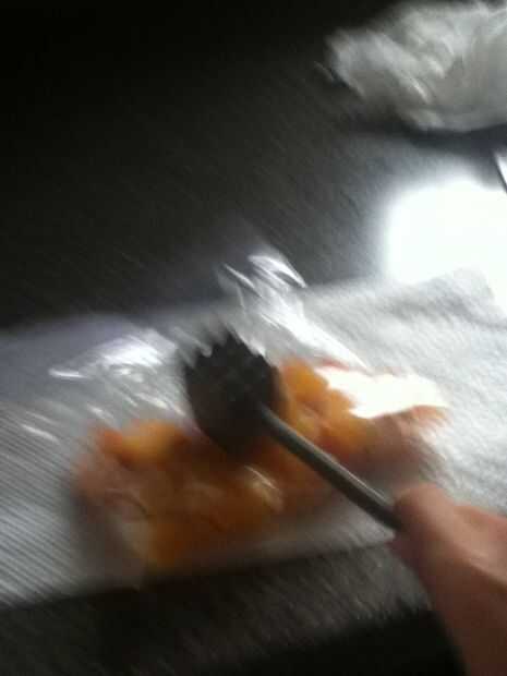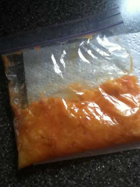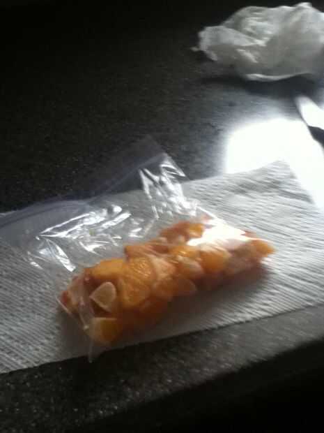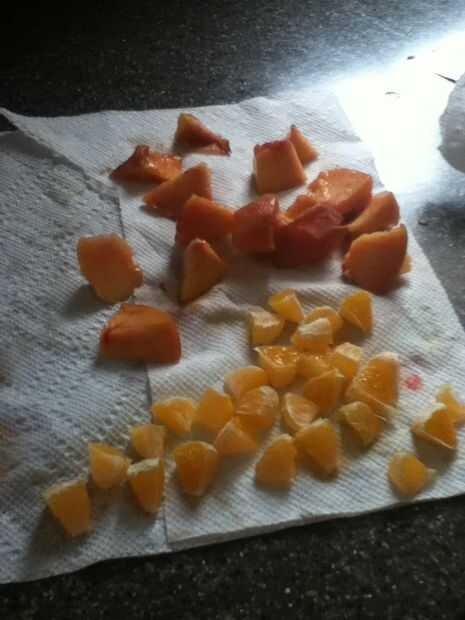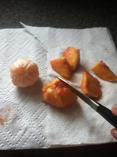 Mitad de un durazno y una naranja de cutie (o el tamaño de una naranja de cutie) pela la naranja y corta el melocotón y la naranja en varios pedazos. Ponerlos juntos en una bolsita y mush up. Aplicarte a la cara durante 15 minutos y luego enjuague bien