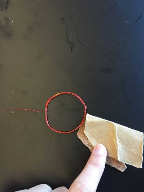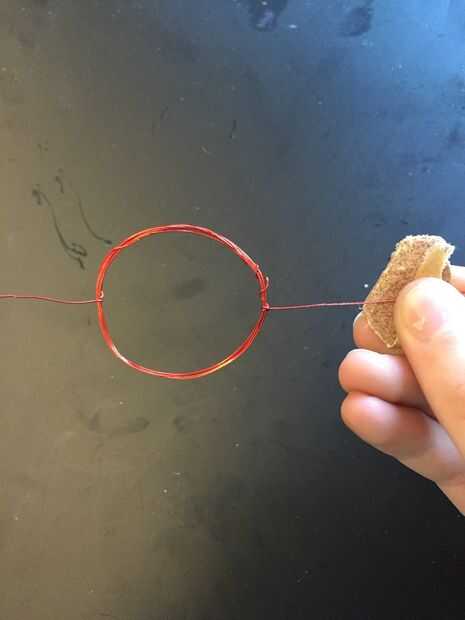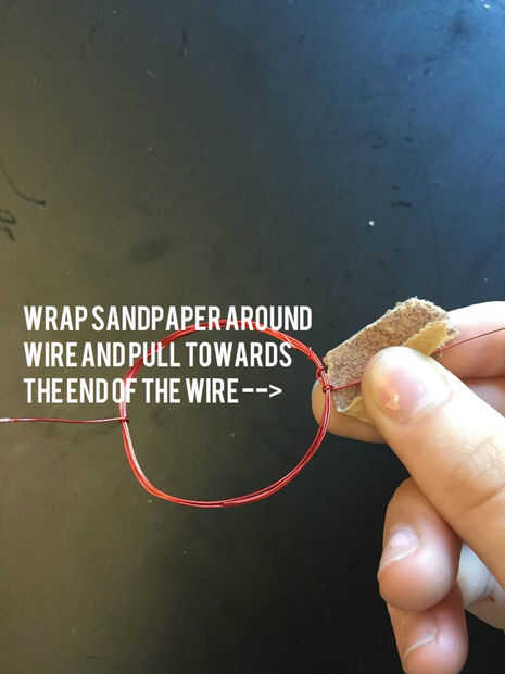 Tomar el papel de lija y quitar todo el esmalte en un lado de la bobina. En el otro lado de la bobina, tira la mitad del esmalte en el cable. Para hacer esto, tome el papel de lija y ejecutar a un lado del cable, tenga cuidado de no pelar apagado más de la mitad.