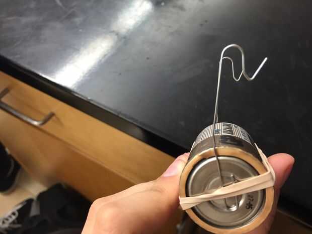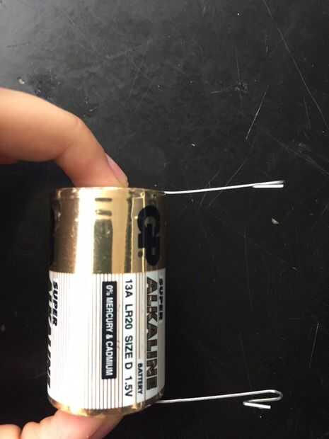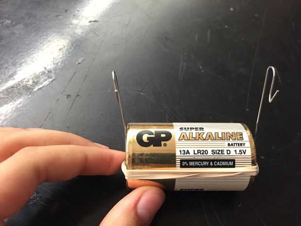 Una vez que el preparado de la bobina y los clips en forma de gancho como forma, tomar la batería de D y coloque los clips en el extremo positivo y el extremo negativo.