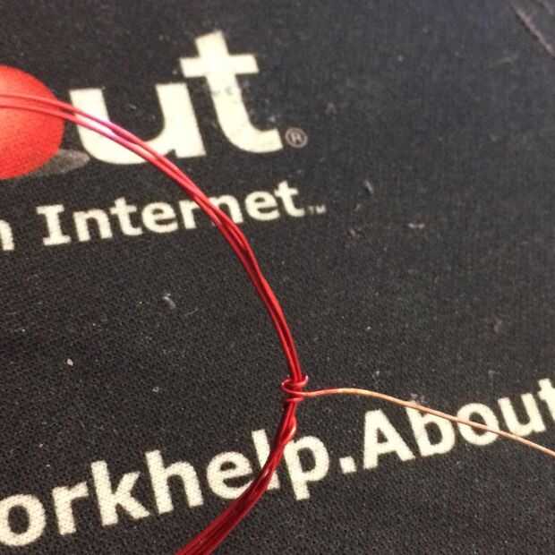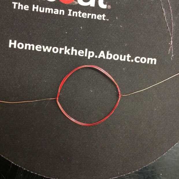 A continuación enrolle el hilo rojo alrededor de la batería para hacer un círculo. El círculo debe ser aproximadamente la anchura de su batería. Mediante el juego, hacen dos extremos de la etiqueta para que pueda sentarse en los dos clips de papel. Luego lije la pintura roja de los extremos de la etiqueta