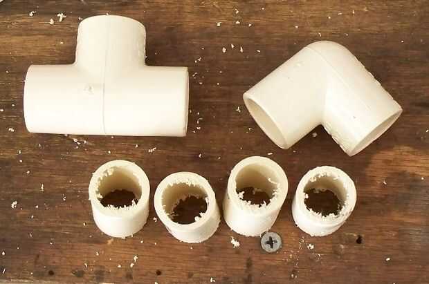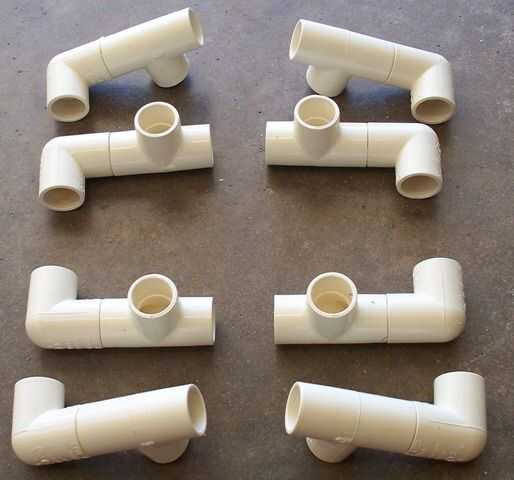 Las uniones de los extremos están hechas de una "T", un corte de 1 pulgada y un codo.  Se pegan, pero no son todos iguales.  La imagen muestra todas las juntas de extremo cuando haya terminado.
