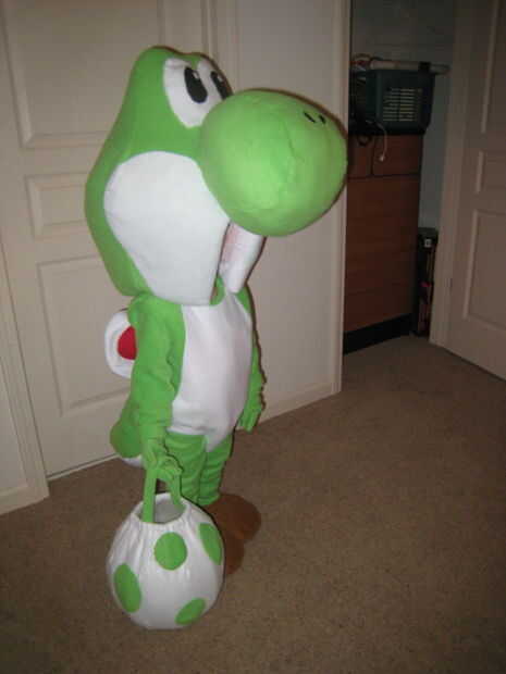 Con los trajes decidieron que me fui a trabajar en el diseño. Mario de bebé sería bastante fácil, así que mi principal preocupación era Yoshi. Quería construir Yoshi a escala, es decir, la cabeza de Yoshi es aproximadamente el mismo tamaño que su cuerpo. Mi hijo de 4 años es el tamaño perfecto y la fuerza para poder lograr esto. Por esta razón decidí probar y hace una mascota de traje en lugar de un sombrero o máscara. No había visto un traje como este por ahí y pensé que sería muy divertido hacerlo.
