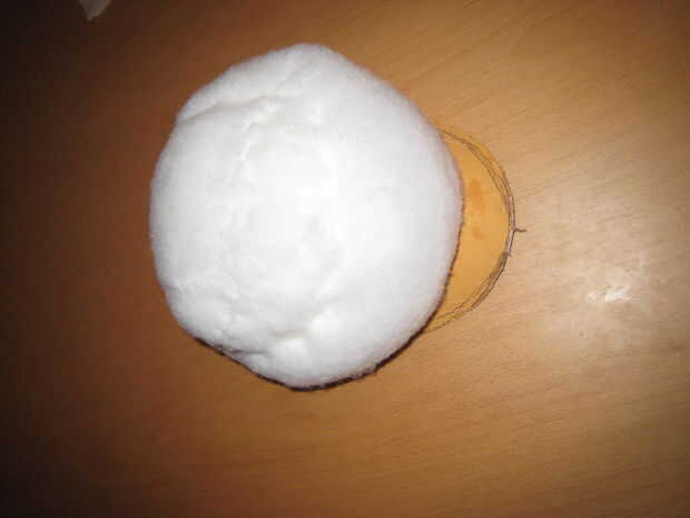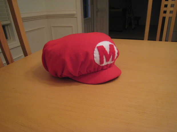 Corte la tela para cubrir el borde y la mano lo cosida en. Cortar tela para cubrir el sombrero y poner elástico en la parte inferior. Añadido a la "M" con blanco y rojo fieltro y la mano lo cosió en.