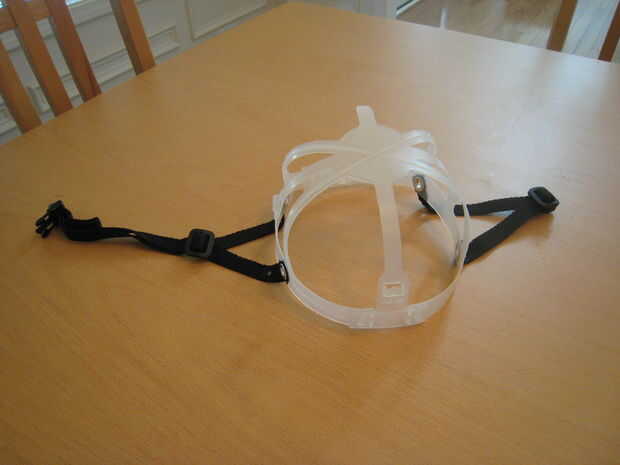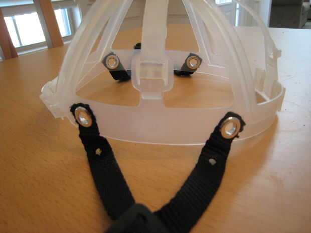 Lo hice teniendo una construcción niños jugar sombrero y sacó el interior anillo plástico. Entonces tomé la correa de la barbilla de un casco de moto de buena voluntad y sujeta a la anilla de plástico del sombrero de la construcción con ojales (yo habría utilizado remaches, pero no pude encontrar el tamaño correcto). Una lección aprendida es asegurarse de que pones las correas de la barbilla hacia adelante un poco... de lo contrario moleste el cuello.