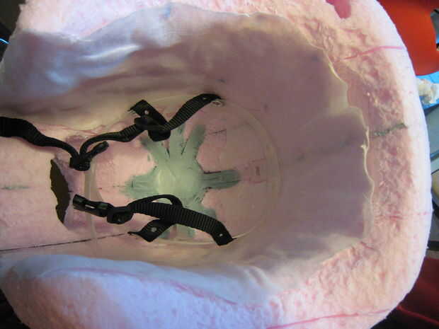 Luego pegué la pieza de plástico de cabeza en su lugar y un forro de paño en el interior de la cabeza para mantener una barrera entre mis hijos y la espuma de poliestireno. Usé el adhesivo para la correa del mentón, puesto que allí no era un ajuste apretado entre ella y la espuma de poliestireno. La tela que usé el pegamento CA.
