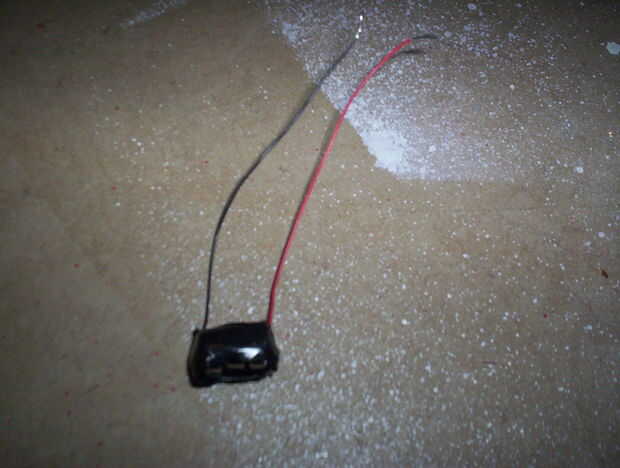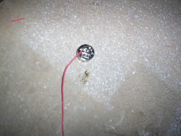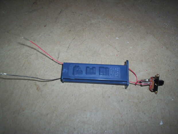 En primer lugar, usted necesitará hacer un paquete de baterías para el LED. Me tomó 2 cables y "bolas" de soldadura en los extremos de cada uno. Luego tomar 3 celdas moneda y apilarlos. Poner un alambre en la parte superior y un cable en la parte inferior. Asegúrese de que usted código de colores los cables para saber cuáles debe conectarse el LED. Envuelva las baterías y los cables con cinta aislante, lo que hace que una batería. Entonces, la soldadura de uno de los cables a un contacto del interruptor. Después de eso, soldar otro cable al otro contacto del interruptor. Recuerde shrinkwrap eras soldado por lo que el interruptor no corta hacia fuera. La batería en la carcasa de la cuña y asegúrese de que el interruptor sale de la parte inferior. Luego enrosque el cable que sale del interruptor y el otro cable por la parte superior.