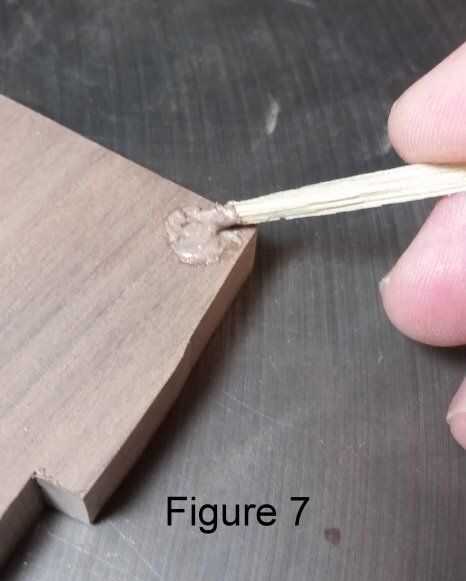 Trabajar la mezcla del pegamento/del serrín en el defecto que desea reparar. Montículo en la parte superior un poco para permitir la contracción mientras el pegamento se seca. Figura 7 es desde otro servicio en la misma madera.