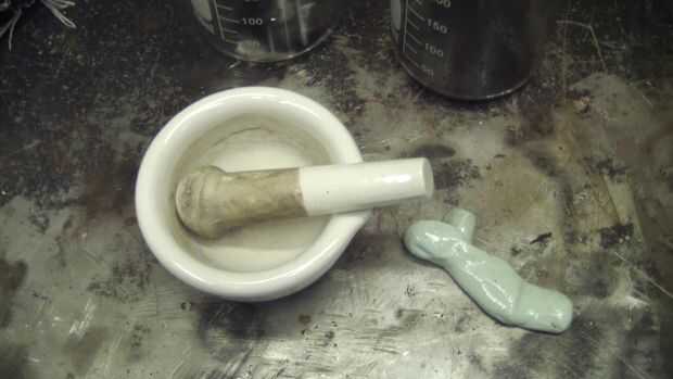 Utilice un mortero y mortero para moler las limaduras de hierro en polvo fino.
