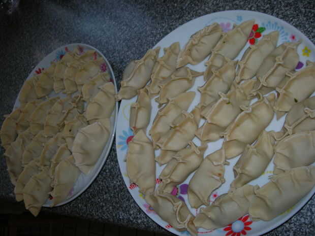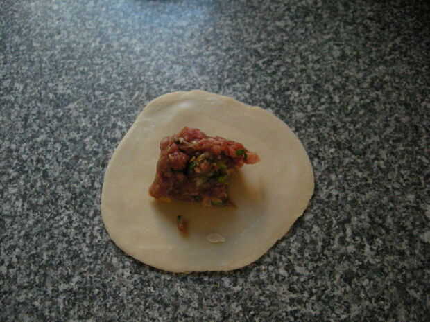 Tire hacia arriba la masa de la parte inferior para hacer dobleces y asegúrese de que usted cierre firmemente encima de la bola de masa hervida.