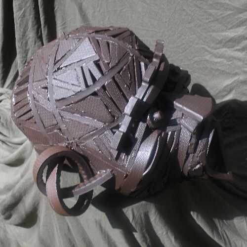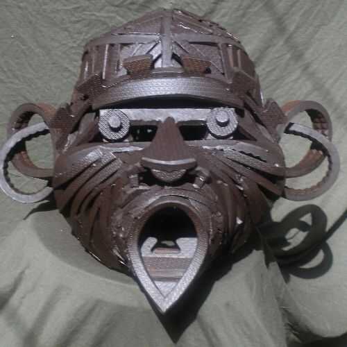 This is a mask of Goblin from the Pathfinder board game series. Fue hecha para una cafetería de juego ubicada en el barrio de NDG en Montreal, Canadá. Dado que es un café, un bigote desmontable y un sombrero de taxista fueron agregados.He escrito un