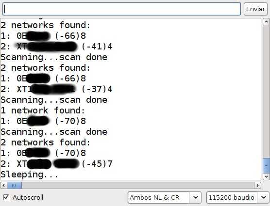 Una vez cargado el boceto en el ESP8266, el LED parpadeará cuando se lo encuentra de una red inalámbrica abierta y pasará a través del modo de suspensión, también se puede ver en el monitor serial cada uno del WiFi de encontró.