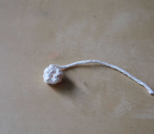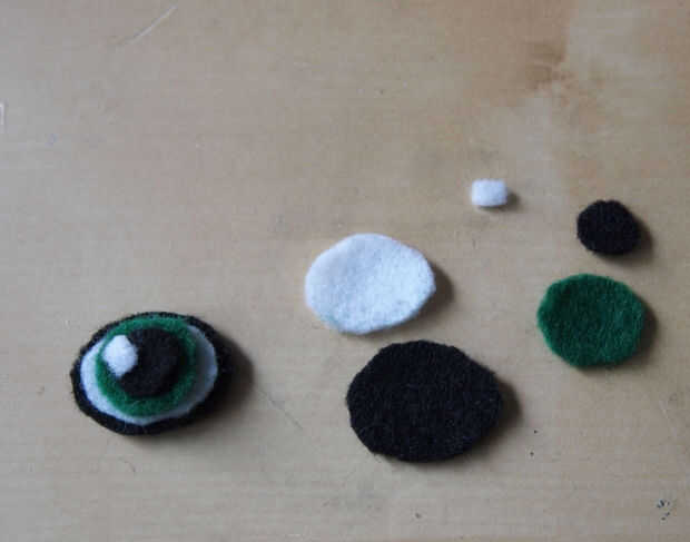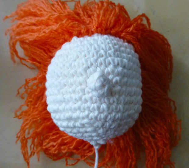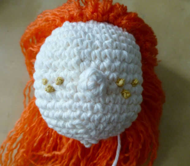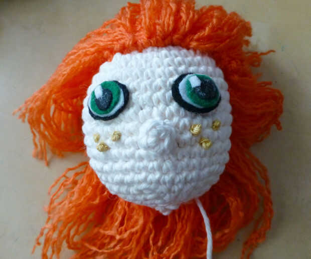 Creé los ojos con fieltro verde, blanco y negro y había pegado en el. Hice nudos con hilo amarillo para las pecas. Luego cosí la nariz a la cara.
