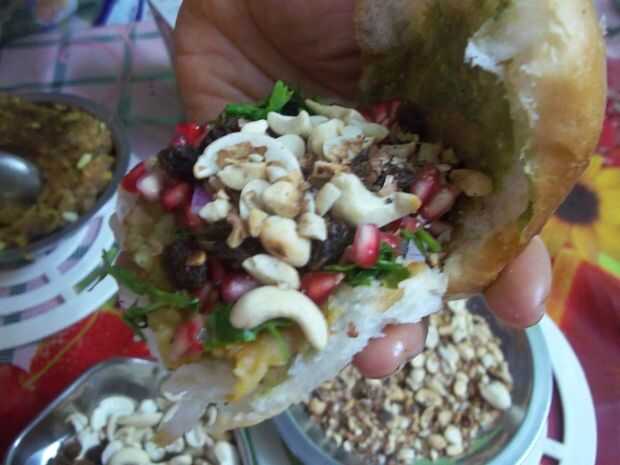 Piel y adecuadamente puré cocido patatas. Tomar 3 cucharada refinado de aceite en una sartén y poner algunas semillas de mostaza. Ahora, poner el puré de papas y freír bien. Después de 5 minutos, ponga dabeli masala (3 cucharas de sopa) y sal a gusto. Y revuelva por dos minutos más. Corte paav en dos mitades horizontalmente. Aplicar Tamarindo salsa y pasta de frío + cilantro y mangos crudos en los lados y poner puré de pasta. Luego aplicar cebolla finamente picada, cilantro picado Granada semillas y cacahuates tostados, anacardo picado y kishmish. Ahora apriete ligeramente paav en ambos lados para que el material se establece correctamente. Aplicar mantequilla sobre paav tawa y freír hasta color marrón claro aparece y prepárate tener dabeli sabroso de sabroso y delicioso.