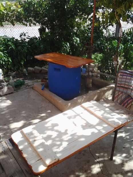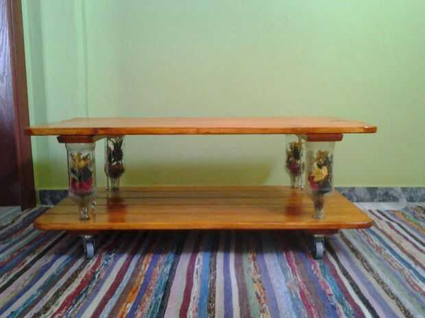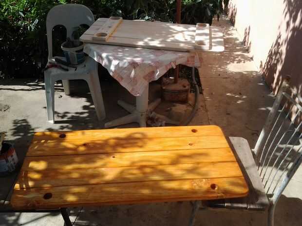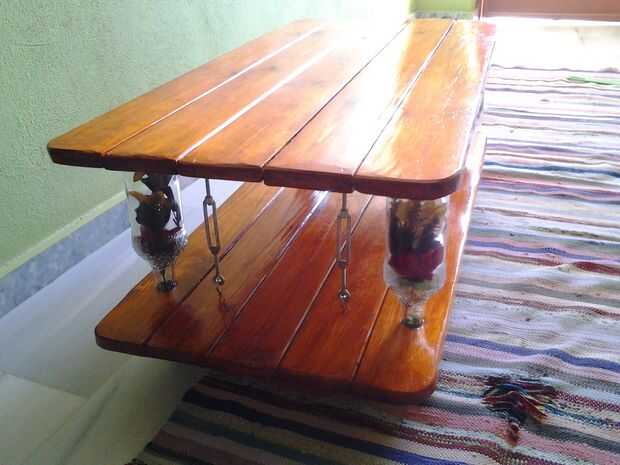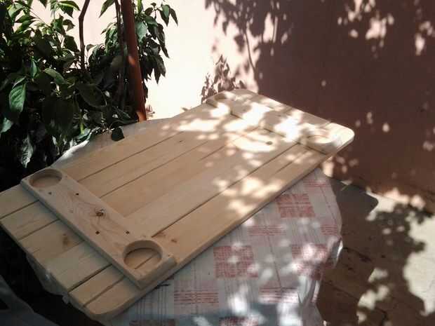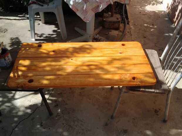 Construcción: I lijar toda la madera con la amoladora de ángulo (al usar amoladora por favor guantes de trabajo), a continuación igualan longitud de madera y montado toda la parte y pulido.