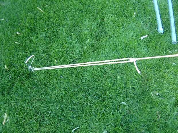 tautline enganche con el extremo suelto de cada cuerda a cada uno de los anclajes. El enganche tautline es un nudo que le permitirá hacer ajustes en cada cuerda chico para sostener el mástil perfectamente vertical.