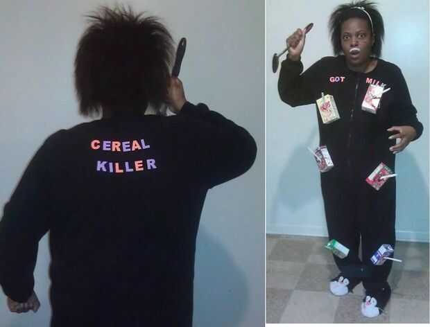 Pegué las cajas vacías de cereal en el pijama pegado los cuchillos a través de las cajas y poner la sangre falsa en él y dejar secar. Luego puse las letras en y luego pegado algunos cereales de applejack en mi cabeza y dejar secar. Tuve mi hija a tirar sangre falsa en mi cara y luego le puse la venda en mi cabeza y frotó mis dedos por mi cabello rápido para darle un aspecto salvaje y le puse una tira blanca de pintura de la cara sobre la parte superior de mi labio.