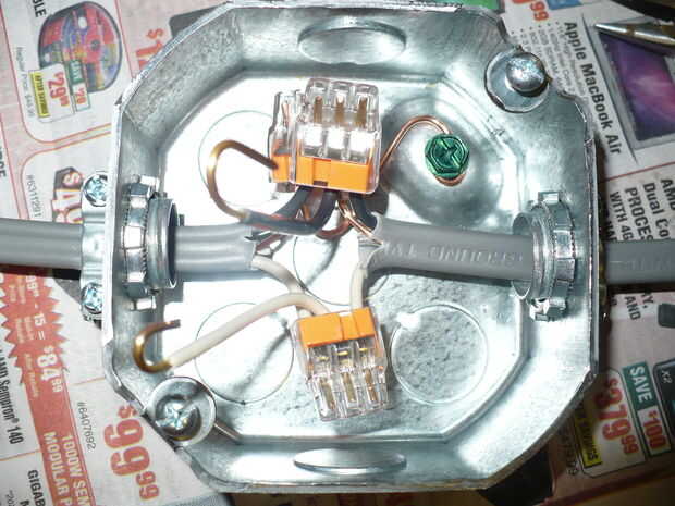 Para cada caja del medio de la carrera, vas a tener que crear una "colita de cerdo" para conectar el portalámparas, y también vas a necesitar conectar el siguiente cuadro en el funcionamiento.