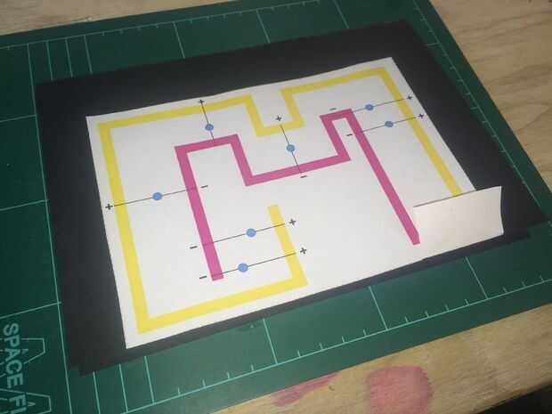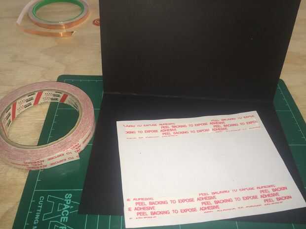 4. aplanar la tarjeta negra y poner cinta adhesiva en la parte posterior y posición dentro de la tarjeta de doble batería es alineado con el borde inferior de la tarjeta, y centrado en. Cuando doble la parte superior de la tarjeta hacia abajo de los agujeros debe estar alineado con los puntos azules debajo.