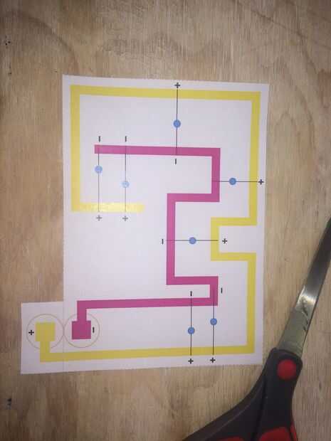 1. corte alrededor del borde de la línea punteada gris sobre la plantilla impresa. Doble la lengüeta de soporte de la batería entre el + y - contactos de la batería.