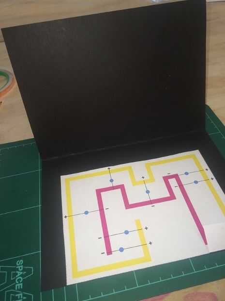 2. doble la tarjeta negra a la mitad. Con el doblez de la tarjeta en la parte superior, coloque la plantilla para que la tapa de la batería es justo en el borde inferior y centrada.