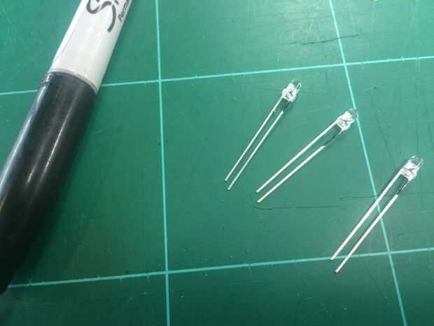 1. con un marcador permanente, marque la parte superior de la pierna larga (+) de cada LED. Esto es para ayudarnos a recordar que es positivo (+) y negativo (-).