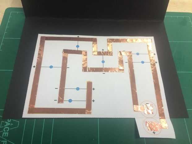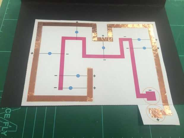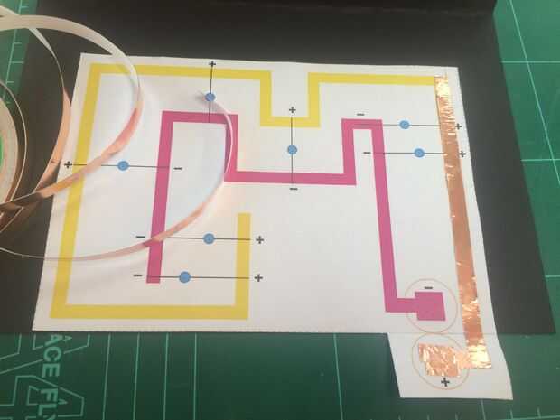Ahora nos pegaremos a la cinta de cobre para que el amarillo (+) y rosa (-) las pistas en la plantilla de papel tienen todo dado vuelta cobre! Cortar la longitud de cada segmento de línea y se superponen los extremos para que haya una pista intacta para los electrones a fluir a través. Las pistas de amarillo y rosa no deben tocar entre sí.