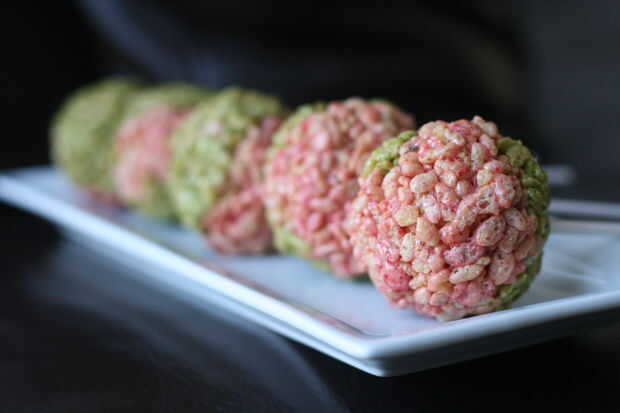 La parte más delicada de esta receta está realmente ejecutando simultáneamente dos diferentes tandas de mezcla de krispies de arroz - un té verde (matcha) y una fresa. Ambos deben ser al mismo tiempo.