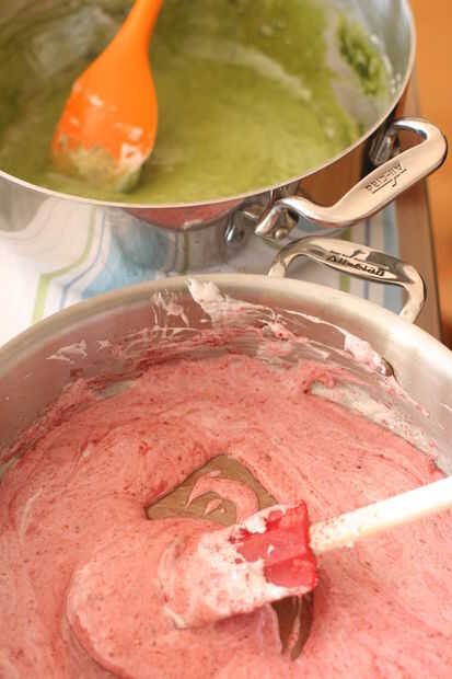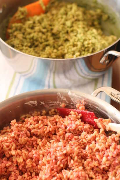 En sartén grande derrita la mantequilla a fuego bajo. Agregar los malvaviscos y mezclar hasta que se derrita totalmente. Añadir pulverizados fresas o arándanos. Mezclar rápidamente. Retirar del fuego.