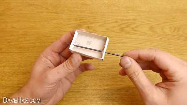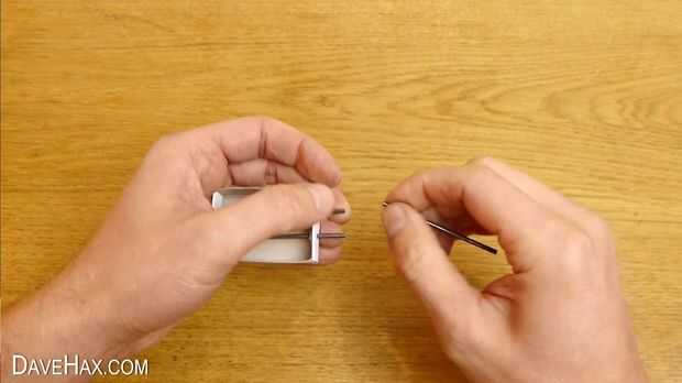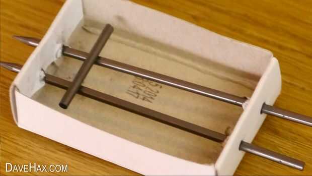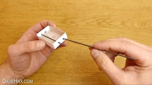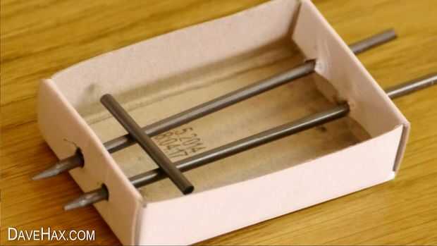 Inserte el grafito en uno de los agujeros en el cajón de la caja de cerillas y sale por el agujero opuesto, como se muestra en la imagen. Quite el grafito por lo que sobresale aproximadamente 1cm cada lado de la caja de cerillas.
