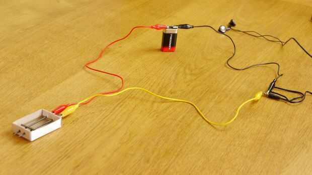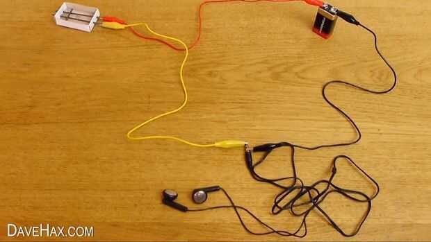 Nos vamos para alimentar el circuito con una batería de 9v, y a controlar lo que suena el micrófono captura a través de un par de auriculares antiguos. La batería va a crear una corriente en el circuito y el micrófono captará las ondas sonoras y convertir a una señal de audio, entonces deberíamos podemos escuchar a través de nuestros auriculares.