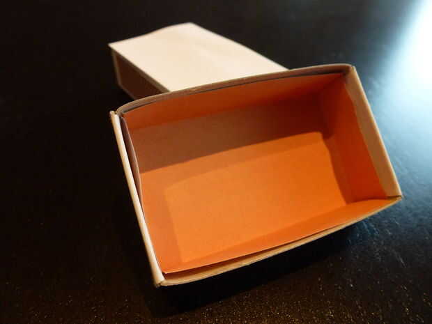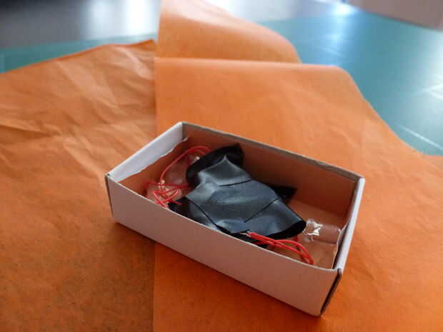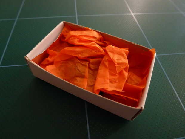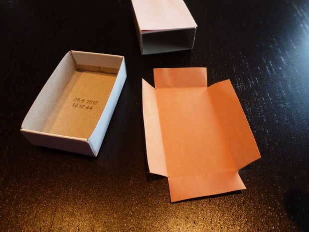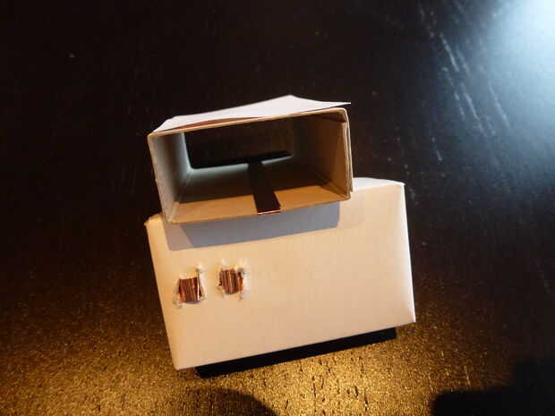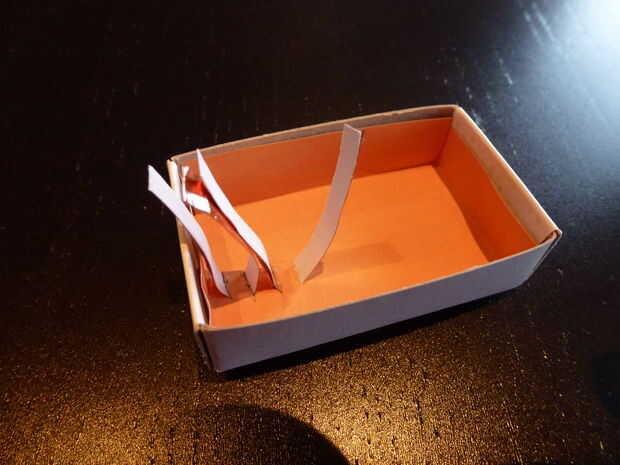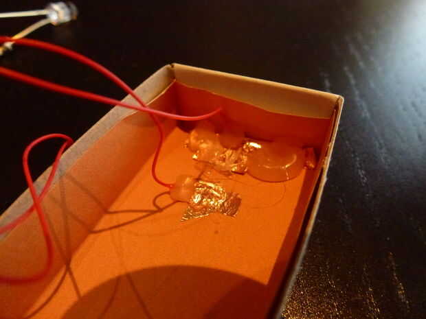 Empecé por que cubre el interior de la caja de fósforos con papel naranja. Entonces usé cinta conductor para hacer dos terminales en la parte inferior de la gaveta de la caja de cerillas, con puntos de conexión en el interior. También he añadido una tira de cinta adhesiva en el interior de la parte exterior de la caja de cerillas. Esto permitirá que los dos terminales hacer contacto cuando el cajón se abre.