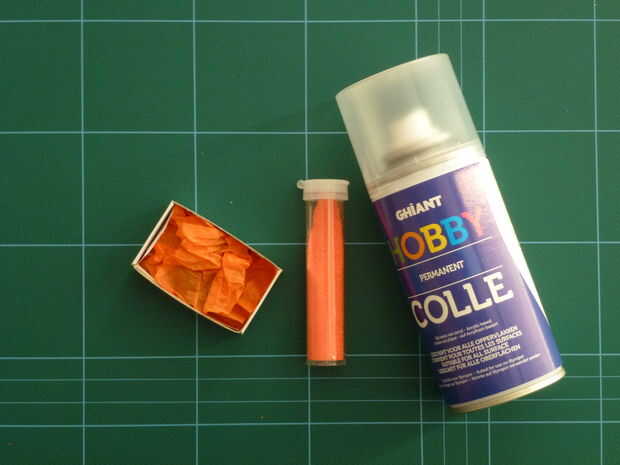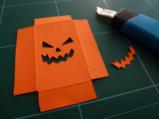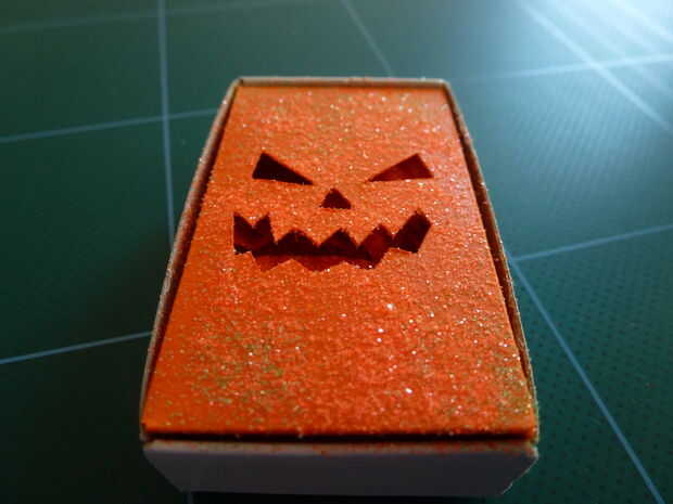 La electrónica fueron agregada a la caja de cerillas, y he añadido una capa de papel naranja fino (un poco transparente) en la parte superior. I esto rocía con pegamento de aerosol y agrega brillo. Luego corte una pieza final de papel naranja, con un recorte de Jack-o-lantern y agregado a esto, otra vez en pegamento de rociadura y agregar brillo naranja y verde.