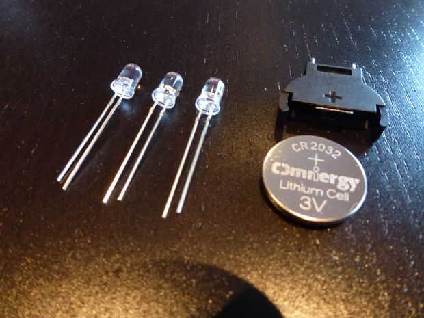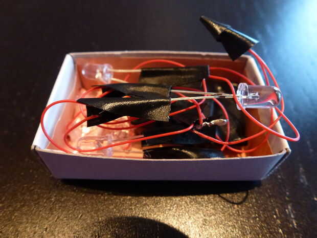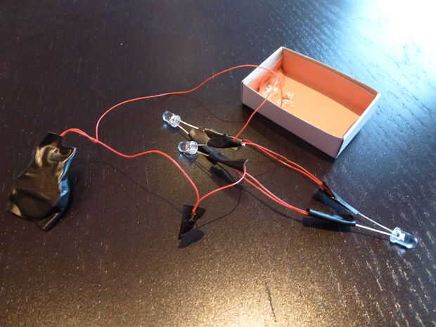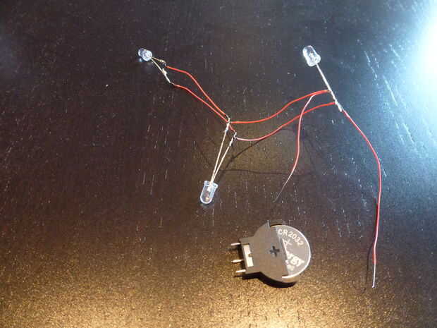 Soldar LEDs naranja tres en paralelo, se conectan a un soporte de la batería y finalmente la conexión a los terminales. No me molesté con resistencias en este proyecto. Todos los LEDs de luz bien y duración de la batería no era un factor importante. Todo el cableado expuesto fue finalmente aislado con cinta aislante para evitar un corto circuito.
