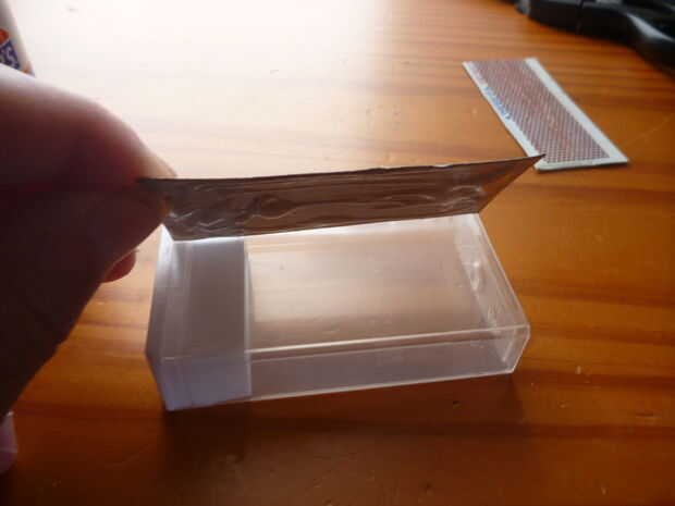 Aplique cuidadosamente el pegamento a la parte posterior de la striker en pequeños puntos de pegamento, colocar un punto en cada esquina, un punto en cada punto medio a lo largo de los lados del delantero y por lo menos un punto en el centro. Ahora lentamente endecha su delantero pegamento el lado hacia abajo en el contenedor centrado en el así como usted puede.