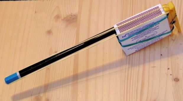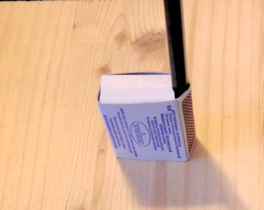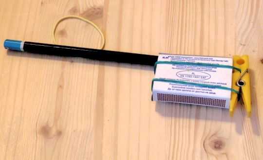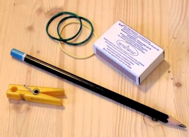 Pasos: Tomar una caja de cerillas. Usted no necesita vaciar, pero se puede, si quiere. Tome un lápiz, longitud de unos 20 cm. pone el extremo afilado del lápiz entre la pared exterior de la caja de cerillas y el lado del cajón, como se ve en la imagen. Tome una pinza para la ropa y fíjelo al otro lado de la caja, Dónde está el extremo afilado de su lápiz. Usar alguna banda de goma (2-3) para arreglarlo. Y ya está listo para disparar. Si eres un chico que es aficionado a lo sofisticado, puedes agarrar una navaja para cortar una ranura pequeña para la banda de goma en el lápiz.