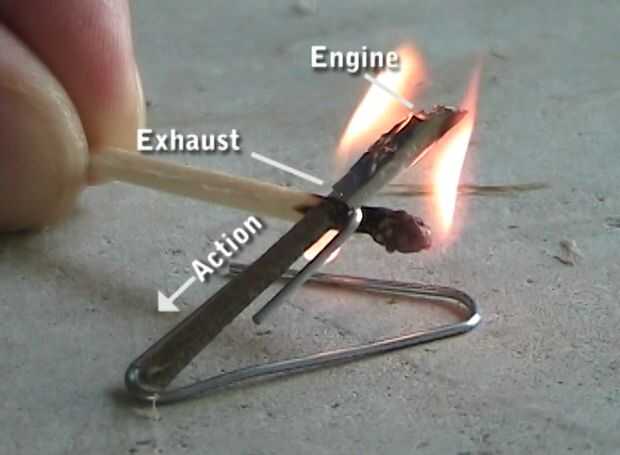 - Cuando el fósforo se quema en un ambiente cerrado, el papel de aluminio se convierte en una cámara de combustión del cohete. La presión se acumula en la cámara hasta que es forzado a través del canal de escape como una corriente rápida de humo y gas.