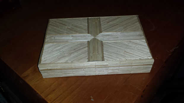 Colin también me dio una caja de puros que él había estado planeando para pintar y me pidió hacer una cruz del St George en la parte superior, después de un pequeño debate decidimos que un diseño que se insinúa hacia una Union Jack así sería interesante, el resultado fue la bandera con los partidos diagonalmente dispuestas en los cuatro paneles de la bandera se contornea con pinchos de bambú , Colin está planeando sutilmente manchar los paneles en blanco rojo y azul.